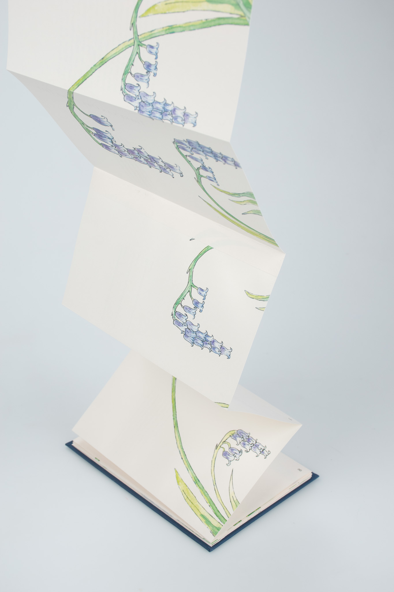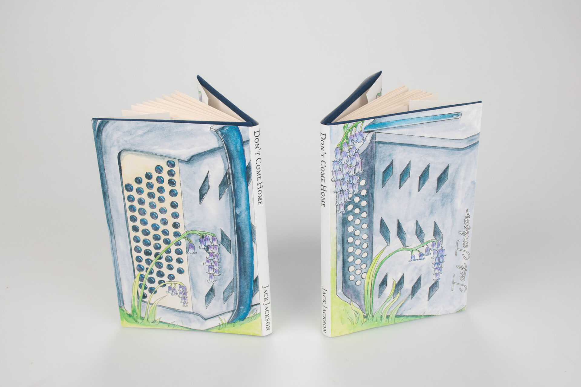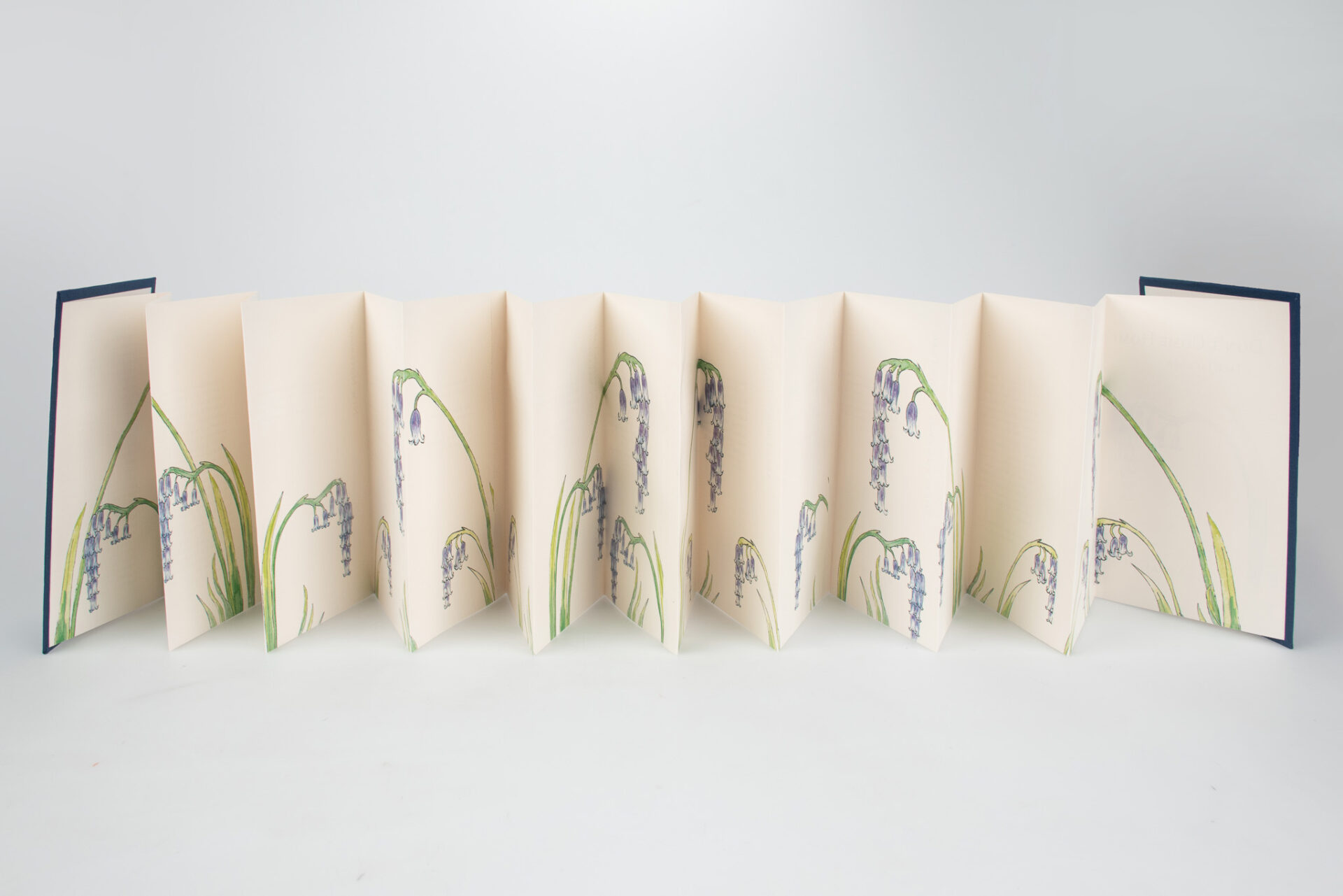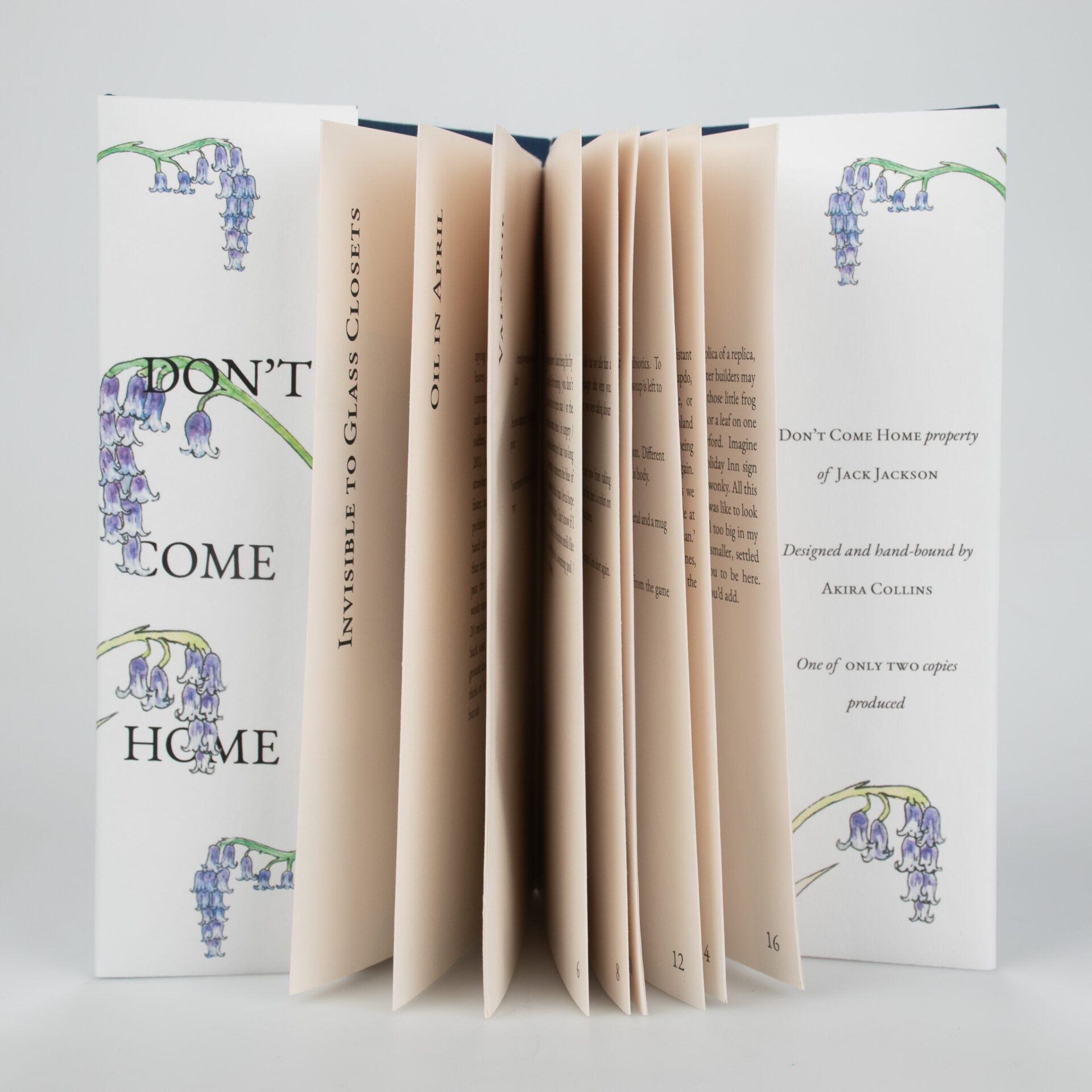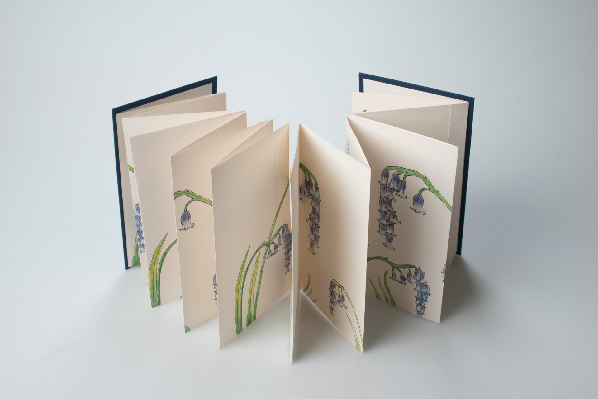 This type of binding is called a Concertina Bind, named after the instrument. It is uncommon to see in mass produced books as it is difficult to mechanize. This binding choice, and the cover illustration, is a nod to one of Jackson’s poems which mentions bluebells and an accordion.