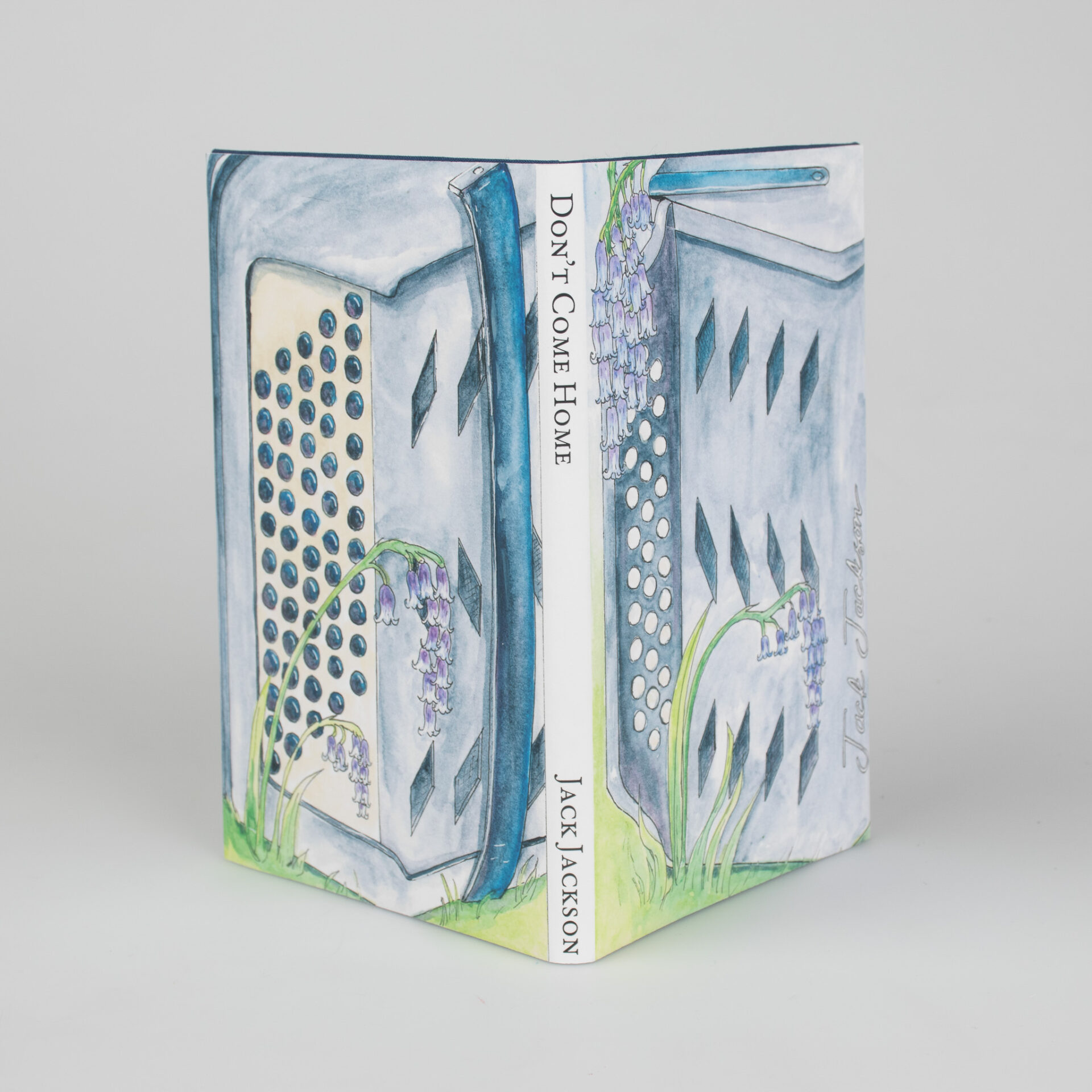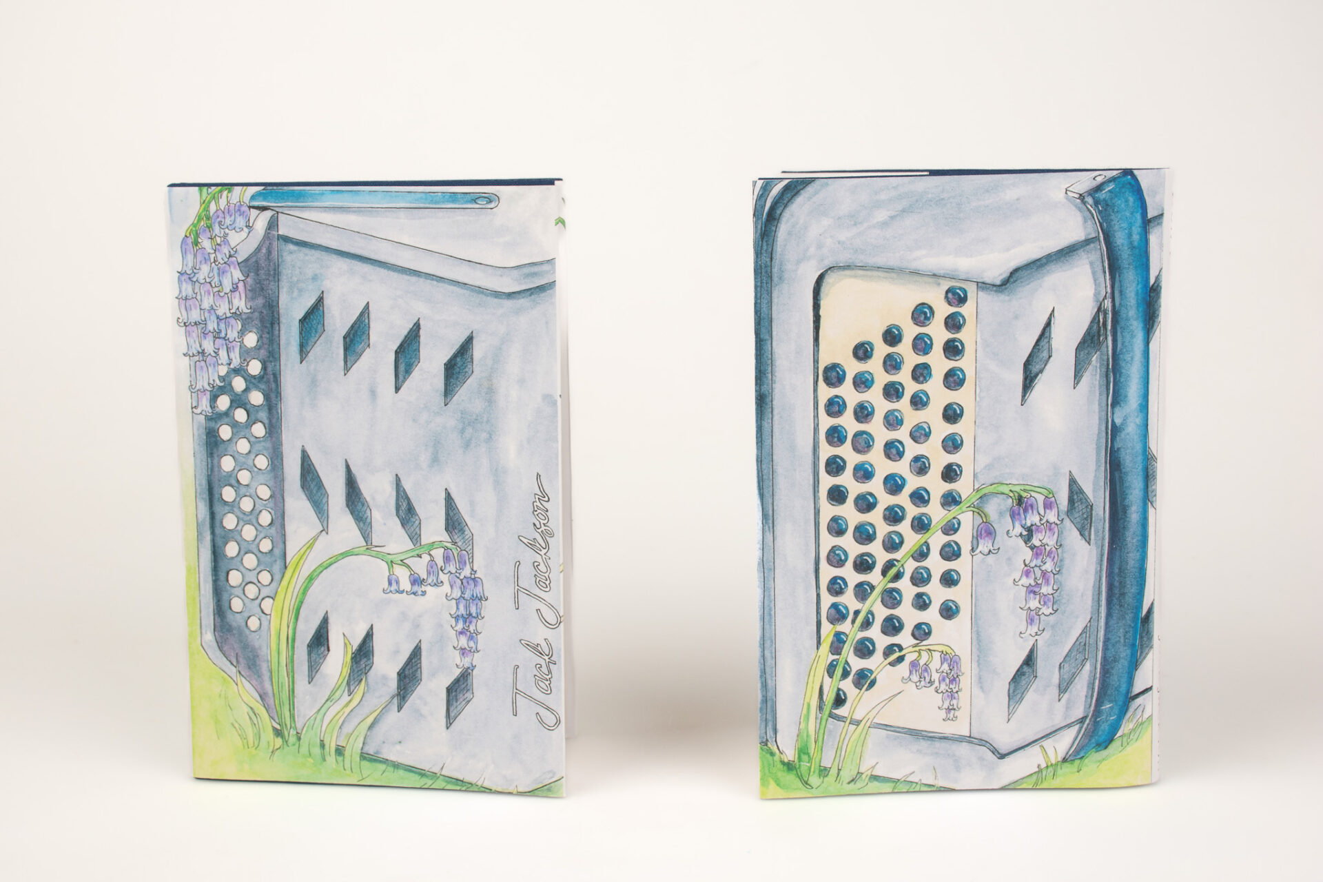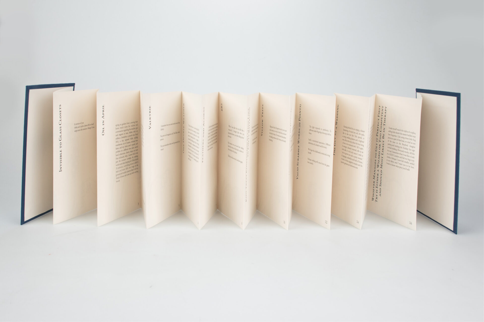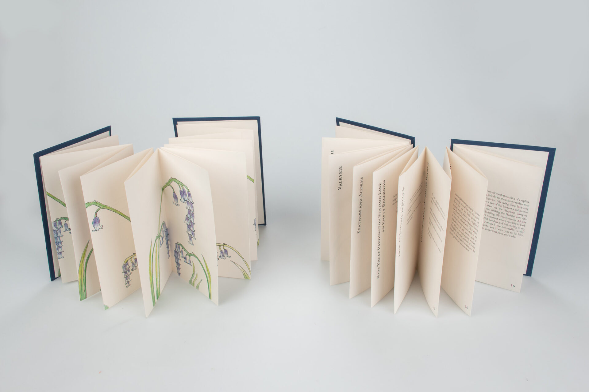 This type of binding is called a Concertina Bind, named after the instrument. It is uncommon to see in mass produced books as it is difficult to mechanize. This binding choice, and the cover illustration, is a nod to one of Jackson’s poems which mentions bluebells and an accordion.
