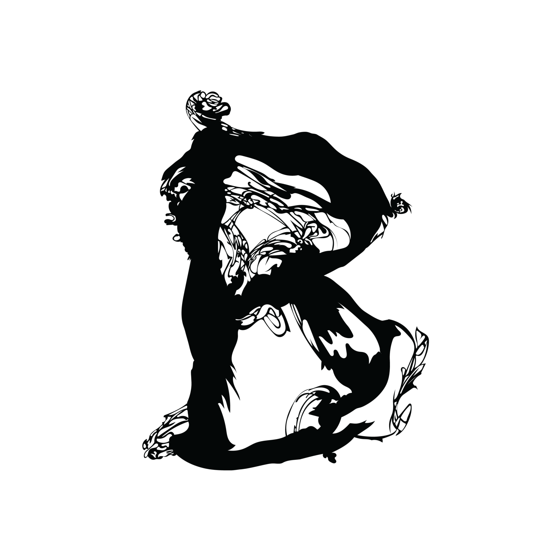 Capital R made to look like ink flowing through water, from the Inkdrop typeface designed by Akira Collins.