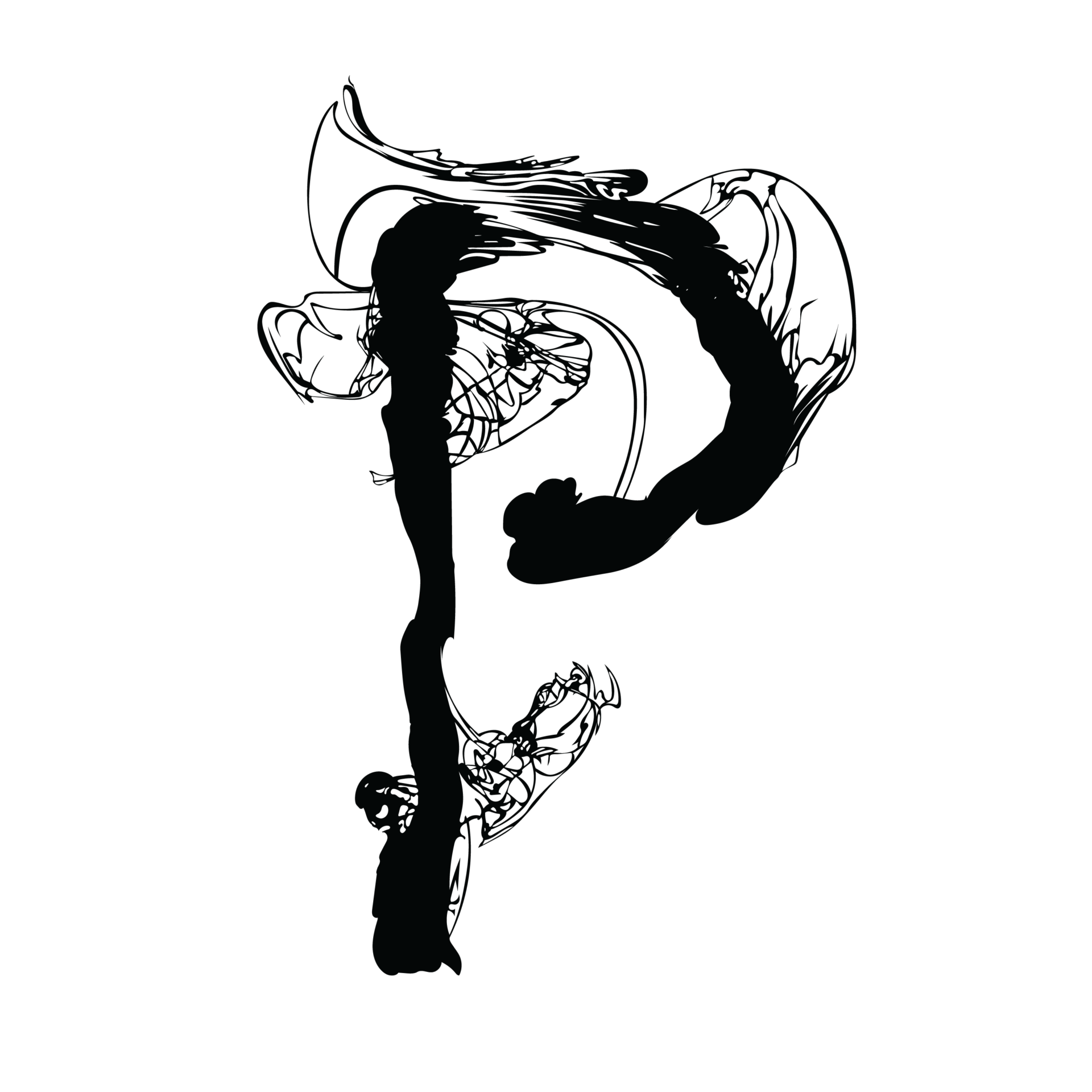 Capital P made to look like ink flowing through water, from the Inkdrop typeface designed by Akira Collins.