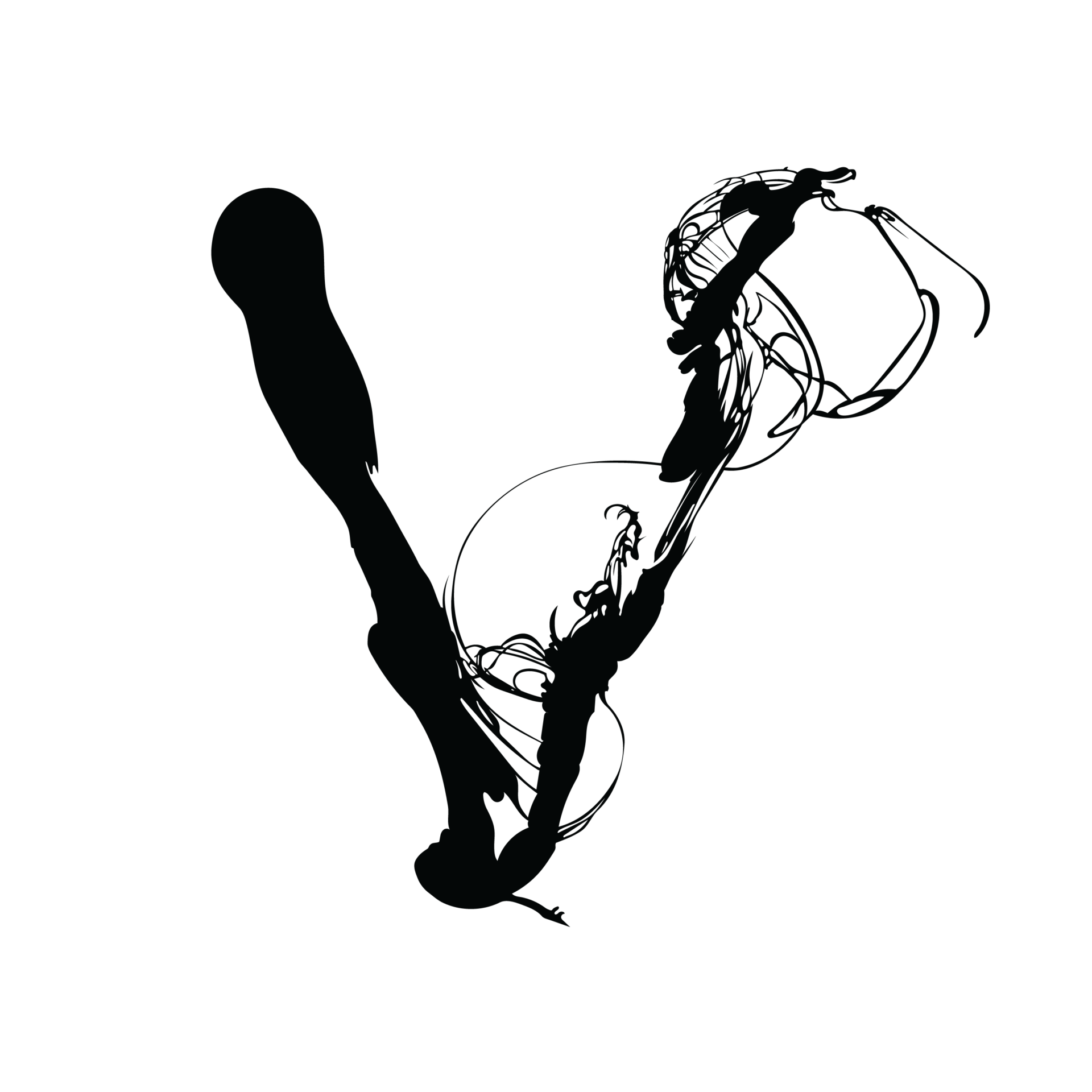 Capital V made to look like ink flowing through water, from the Inkdrop typeface designed by Akira Collins.