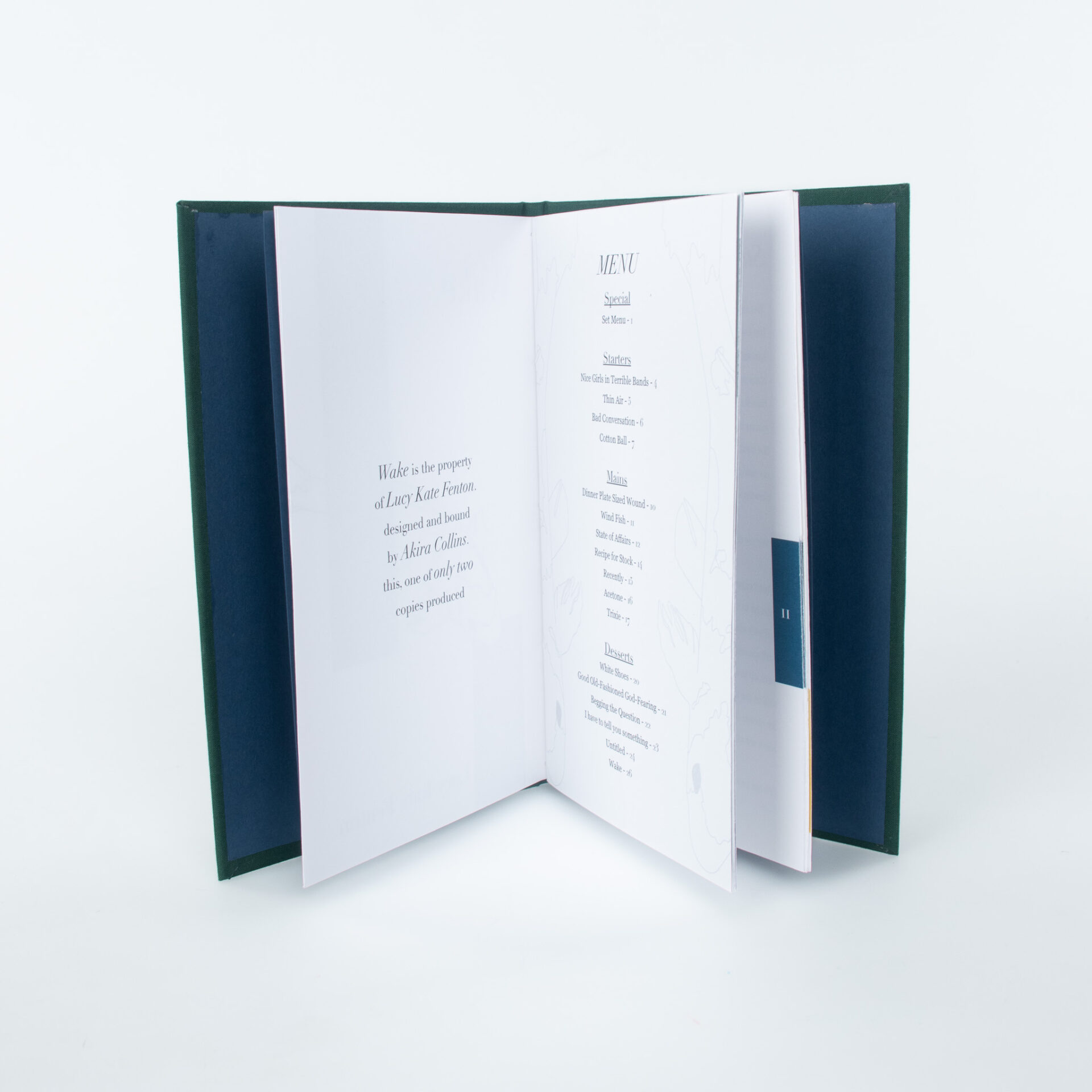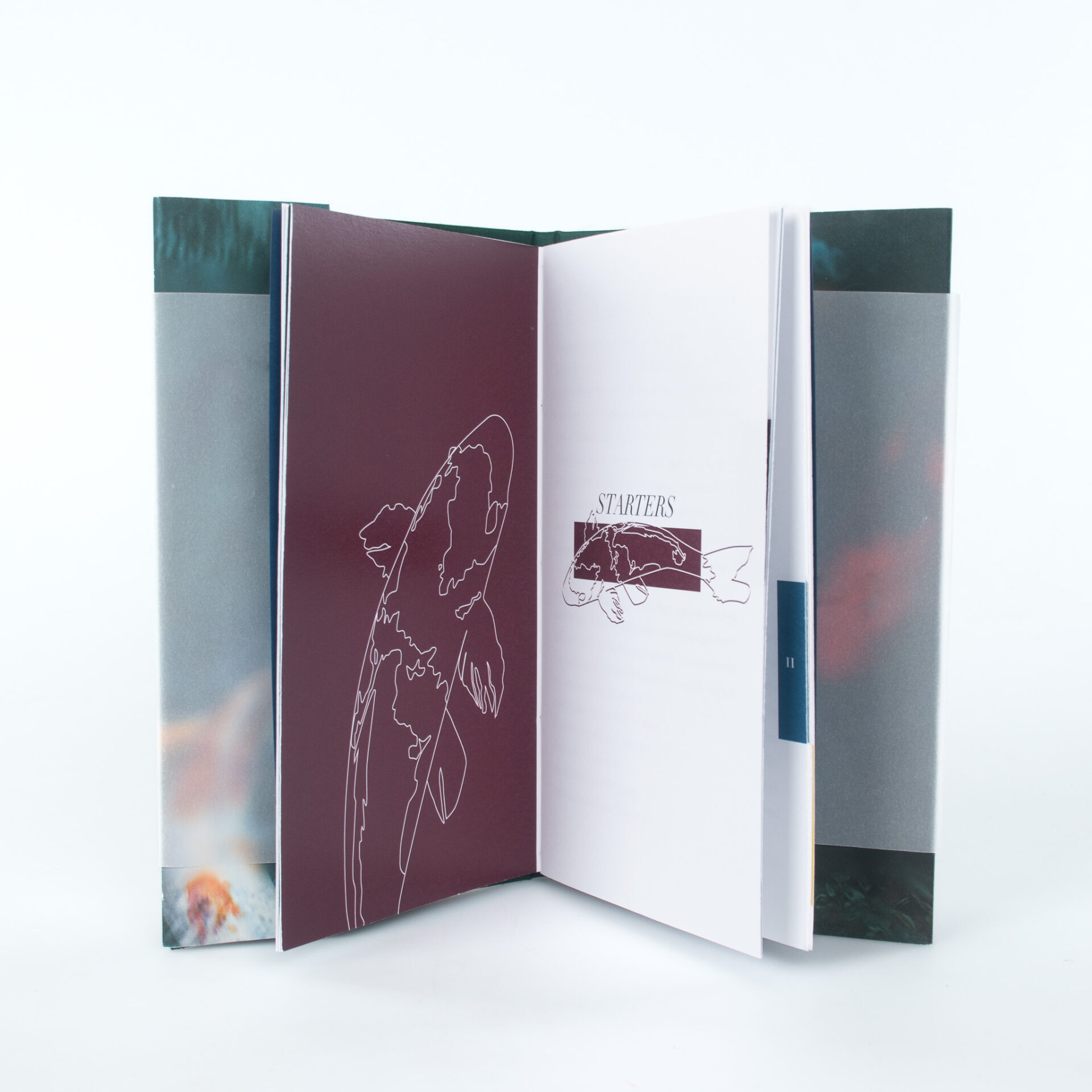 The design of the book echoes the poems it contains. The interior is designed as a menu in line with the poem “Set Menu”. The cover is a nod to the poem “Wind Fish” which contains the line: